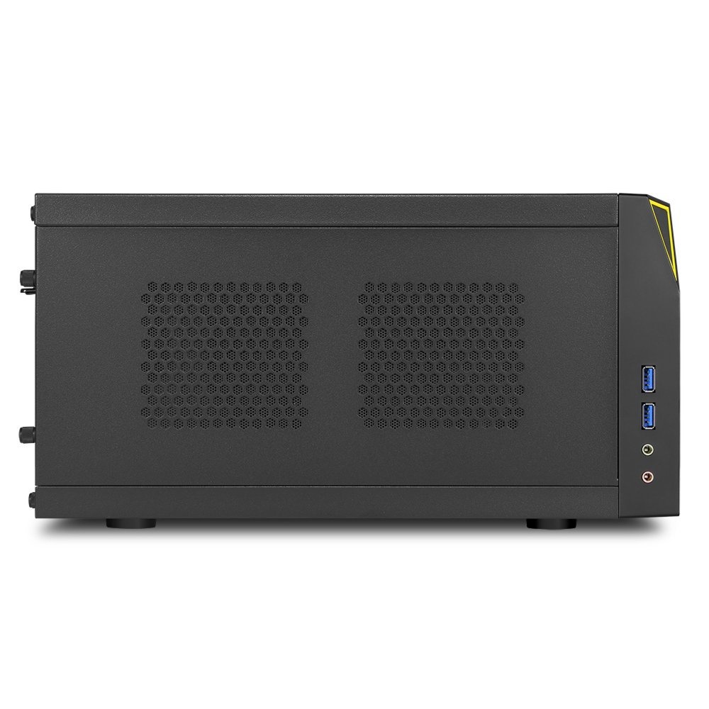 De volledig zwarte SHARK ZONE C10 Mini-ITX PC behuizing biedt maximale flexibiliteit in een compacte ruimte. Dankzij de slimme indeling is er voldoende ruimte voor alle benodigde componenten, inclusief een optisch station. Het stijlvolle SHARK ZONE ontwerp is perfect geschikt voor een krachtige gaming PC. Met afmetingen van slechts 37,0 x 22,5 x 18,0 centimeter (L x B x H) is het ideaal voor mobiel gebruik en bespaart het ruimte op je volgende LAN-party. Door de handige plaatsing van bedieningselementen en interfaces kan de behuizing zowel horizontaal als verticaal worden gebruikt. Daarnaast kunnen conventionele ATX-voedingen worden gemonteerd, met nog meer ruimte voor SFX-voedingen.
