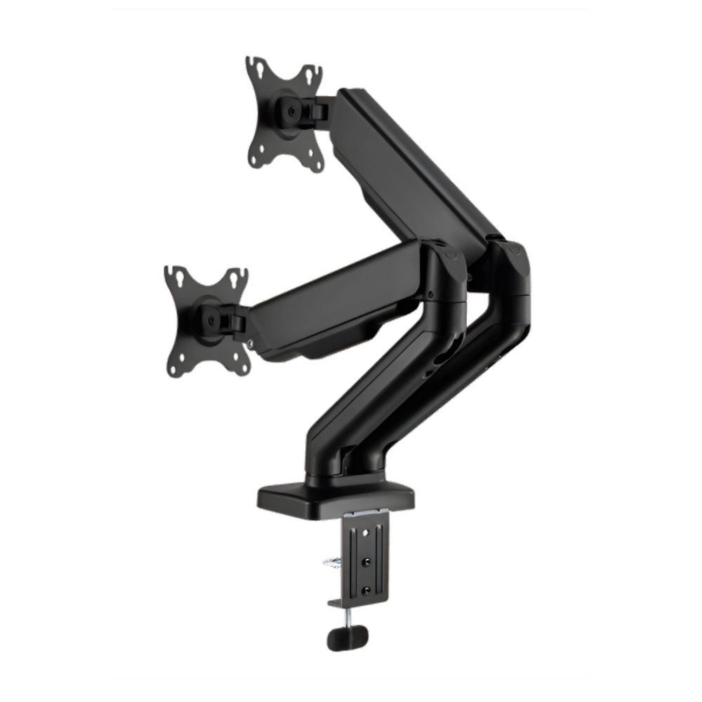Gemaakt van duurzaam staal en kunststof met een zwarte poedercoating, biedt de beugel een moderne uitstraling die past in elke werkomgeving. De armen zijn volledig verstelbaar, met een kantelbereik van +45° tot -45°, een draaibereik van +90° tot -90°, en een rotatiecapaciteit van +180° tot -180°, waardoor je de monitoren eenvoudig kunt aanpassen aan je ideale kijkhoek. De hoogte van de centrale paal is 803 mm, en de armen hebben een bereik van 376 mm, wat flexibiliteit biedt in de positionering van je monitoren.