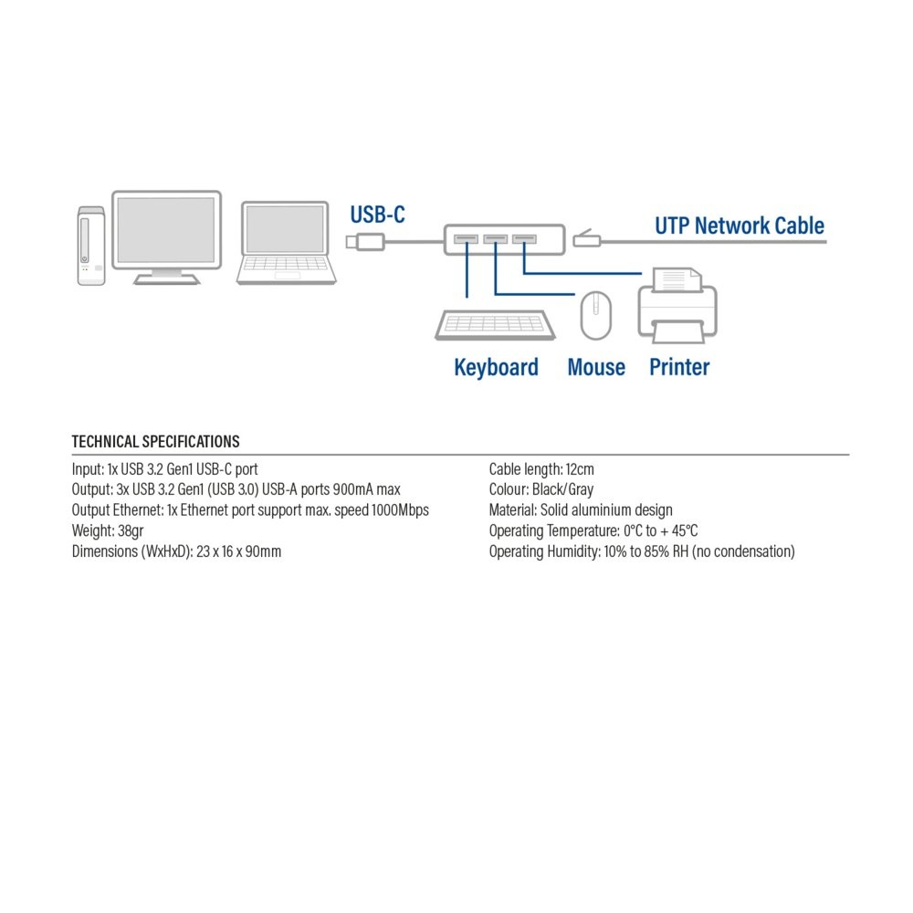 De ACT AC7055 is een handige 3-poorts USB-C 3.2 hub met een Gigabit Ethernet poort. Deze hub is ideaal voor iedereen die meerdere apparaten wil aansluiten. Met zijn compacte formaat is hij perfect voor onderweg of op kantoor.